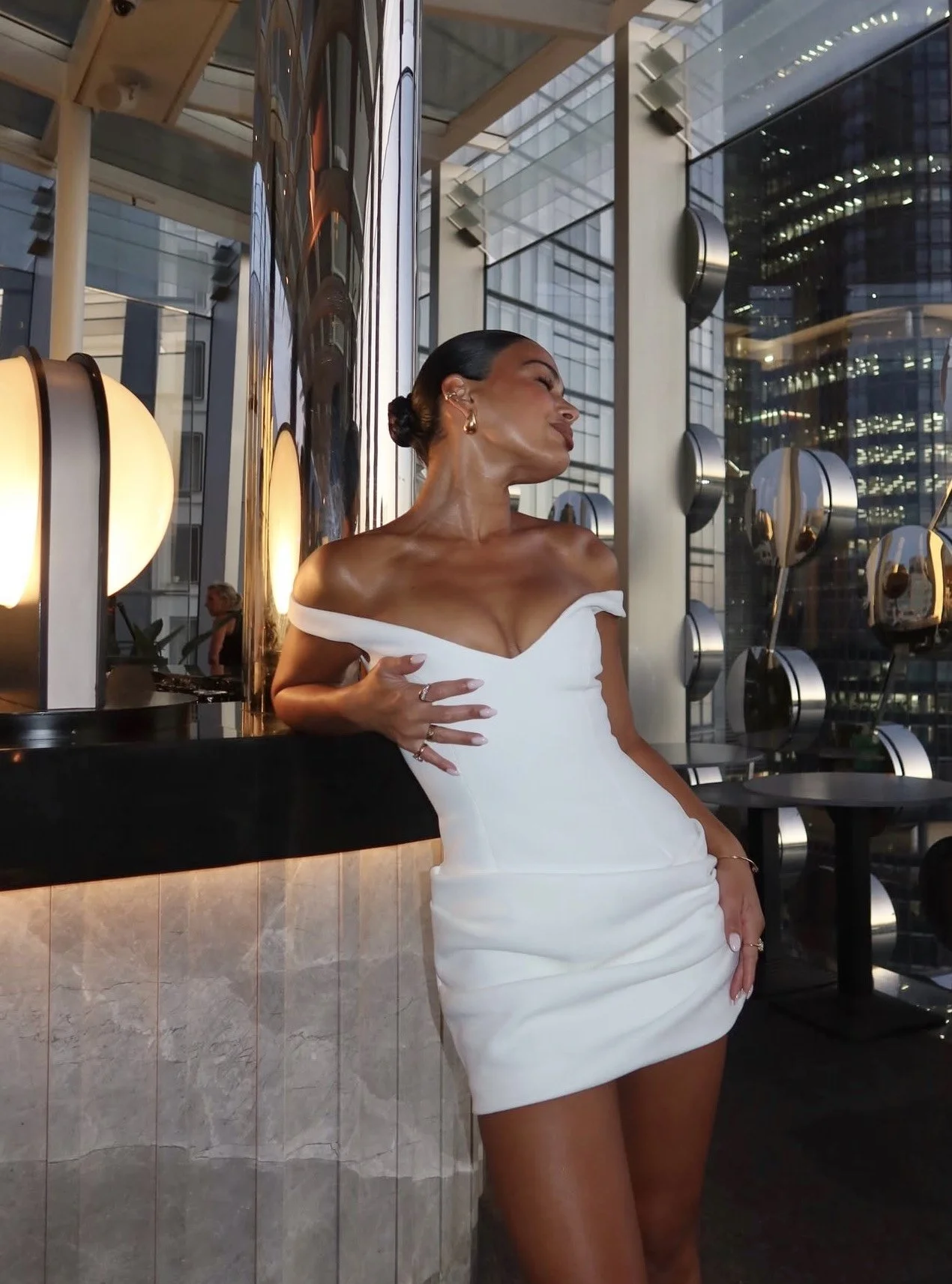 A most-loved silhouette, reimagined in ivory. The Avery Dress is a sensually elegant mini silhouette crafted from a sculpting crepe fabrication. Designed with an effortless off-shoulder neckline that softly frames the décolletage, she features gentle draped tucks at the hips to flatter and accentuate the feminine silhouette. Elevated in both finish and form, Avery is perfect for bridal celebrations, engagement moments, and special occasions.